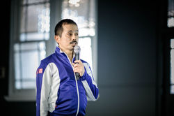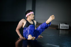 Ryuichi is well known in both the independent dance and the improvised performance scenes and his work in progress makes reference to some of his experiences in those milieu, as a solo performer and as a ‘body for hire’. He goes on to tell of the roller coaster ride of being a jobbing dancer, which entails being at the behest of the whims of an artistic director. We the audience become quickly aware that we are entering the well trodden genre where artists make work about their own work, a territory akin to watching a snake eating its own tail... or perhaps it’s less alchemical and ouroboric and more like watching a frantic dog, chasing its own tail/tale. Which is both funny and pathetic. Fujimura is well aware and in control of the pathos and elaborates with further stories of actual and dreamed success and the less welcome agony of failure and rejection.