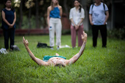 She introduces her work as influenced by the lineage and stories of the Waka Waka people of south-eastern Queensland. She invites us to pass around a blue (toothed) tube of recorded sound and lays her body down in the centre of the circle.